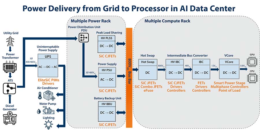 În rack-ul unui server AI, JFET-urile SiC Cascode (CJFET) permit conversii AC-DC și DC-DC de înaltă eficiență în subsistemele cheie de alimentare, inclusiv sursa de alimentare (PSU), unitatea de rezervă a bateriei (BBU), etajul de reducere a sarcinii de vârf – PLSS (Peak Load Shaving Shelf), convertoarele de magistrală intermediară – IBC (Intermediate Bus Converters). Eficiența ridicată și amprenta compactă ale acestor dispozitive susțin profilurile exigente de alimentare ale sarcinilor de lucru AI.