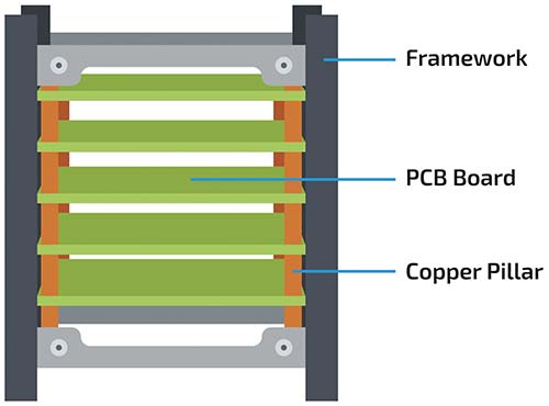 Stivuirea verticală permite stratificarea subsistemelor în spații restrânse, tipice structurilor de rachete și aplicațiilor cu sateliți de dimensiuni reduse. În plus, aceasta permite trasee de semnal mai scurte între blocurile funcționale. Pentru proiectele digitale și RF de mare viteză, reducerea lungimii traseelor îmbunătățește direct pierderea de inserție, marjele de sincronizare și controlul impedanței. Axa Z, care definește conexiunea verticală între plăci sau module paralele, a devenit astfel un element strategic. O interfață bine proiectată pe axa Z permite stivuirea directă fără a compromite performanța electrică sau robustețea mecanică. Cu toate acestea, obținerea unui astfel de echilibru în medii dinamice rămâne dificilă.