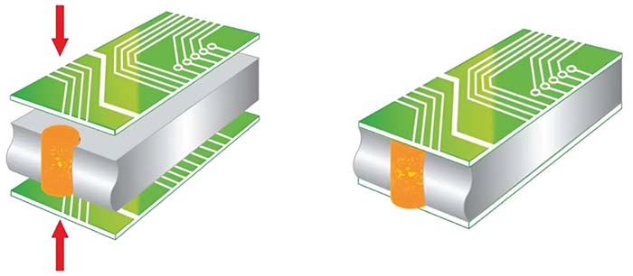 Figura 5: În timpul instalării, interconectarea CIN::APSE® este poziționată între două componente – PCB-uri, circuite flexibile, dispozitive ceramice etc. – cu suprafețe de contact corespunzătoare. Cele două componente sunt apoi comprimate și fixate împreună. (Sursă: Cinch)