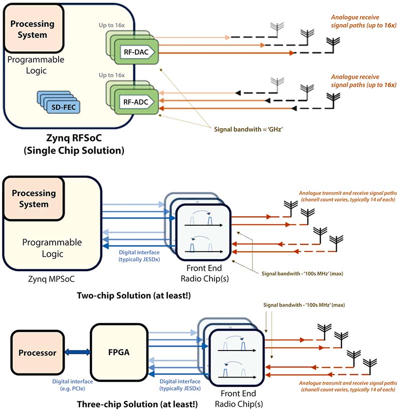Figura 2: Comparație între o soluție SDR bazată pe RFSoC pe un singur cip și alternative cu arhitectură multi-cip. (Sursa imaginii: Software-Defined Radio with Zynq® UltraScale+™ RFSoC)