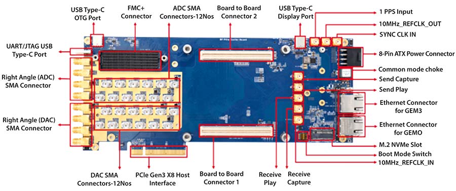 • Oferă conectivitate PCIe Gen3, stocare NVMe, interfețe SMA pentru RF și posibilitate de extindere prin FMC+.