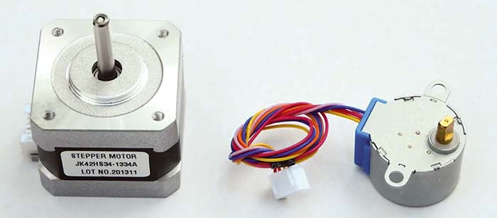 Formate tipice de motoare pas cu pas. Stânga: Motor hibrid bipolar NEMA 17, de înaltă precizie. Acesta are o rezoluție la pas întreg de 200 de pași pe rotație, corespunzător unui unghi de rotație de 1.8°/pas. Dreapta: un motor economic unipolar cu magneți permanenți cu reductor 64:1. Aceasta oferă o rezoluție la ieșire de 2048 pași pe rotație.