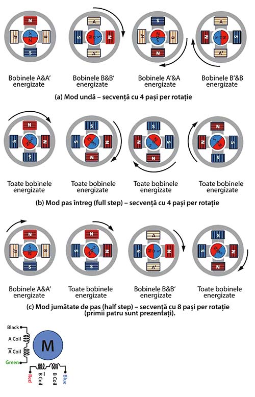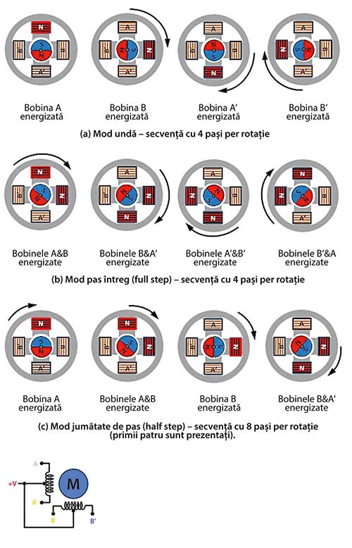 Mod jumătate de pas (Half-Step) (Figura 1.c) – De regulă, un motor are nevoie de 4 pași pentru o rotație completă, dar combinând secvențele modului undă și ale celui cu pas întreg, rezoluția poate fi dublată la 8 pași. Secvența este: A → AB → B → B′A → A′ → A′B′ → B′ → AB′ → A. Cuplul variază însă pe parcurs, din cauza alternării între alimentarea unei singure bobine și a ambelor simultan.