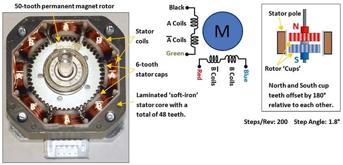 Figura3: Motor pas cu pas hibrid cu 2 faze (200 de pași pe rotație și 1,8° / pas). (©W.G.Marshall 2024)