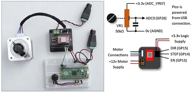 Rețineți pinii Pico la care este conectat potențiometrul. Aceștia sunt diferiți de cei utilizați în demonstrația servo. Configurația plăcii de testare pentru servomotor are capetele potențiometrului conectate la unul din pinii GND și 3V3(OUT) și funcționează perfect. Aceeași conexiune, folosită cu motorul pas cu pas, a dus la o funcționare foarte instabilă – fără ca potențiometrul să fie atins. Motivul: zgomot electric excesiv pe cei doi pini.