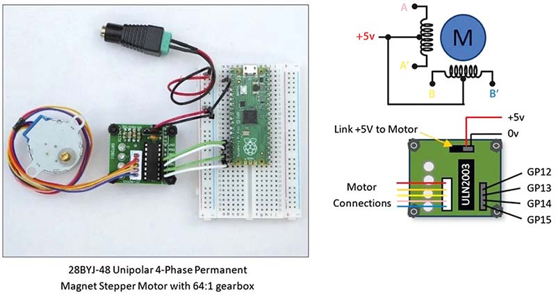 Figura 5: Utilizarea unui driver ULN2003 pentru comanda 28BYJ-48 – Motor pas cu pas cu magneți permanenți unipolar cu reductor 64:1. (©W.G.Marshall 2024)