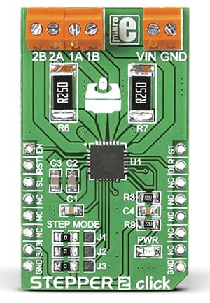 Dacă utilizați o placă de dezvoltare cu microcontroler cu socluri MikroBUS, modulul Stepper 2 Click (Număr stoc RS 136-0748) îndeplinește aceeași funcție. Modulul A4998, o soluție ieftină, se conectează la o placă breakout (de asemenea, disponibilă pe scară largă), care permite setarea celor trei semnale de selecție a modului de funcționare în pași printr-un comutator DIP.
