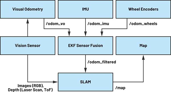 În acest context, combinația dintre măsurătorile IMU și datele furnizate de codificatoarele roților permite robotului să își mențină estimările locale ale poziției.