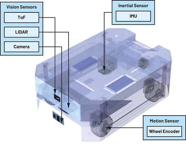 Anumite caracteristici ale mediilor fizice pot afecta eficacitatea diferitelor tipuri de senzori. Pentru a atenua limitările fiecărui sistem senzorial în parte, un AMR tipic se bazează pe o combinație variată de senzori, care poate include sisteme de vizualizare, senzori ToF (time-of-flight), LiDAR, radar, codificatoare de roți și o unitate IMU (Figura 4).