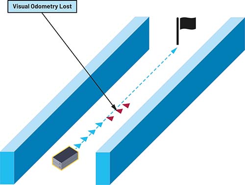 Într-un coridor cu puține caracteristici distinctive, de exemplu (Figura 5), pereții lungi nu oferă suficiente repere pentru algoritmii de localizare și cartografiere simultană (SLAM), care trebuie să coreleze cadrele curente cu o hartă stocată.
