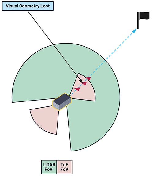 Figura 6: Într-o zonă deschisă mare, unde limitările razei de acțiune a senzorilor și lipsa caracteristicilor vizuale distinctive degradează performanța senzorilor vizuali, măsurătorile IMU și odometria roții pot susține localizarea. (Sursa imaginii: Analog Devices)