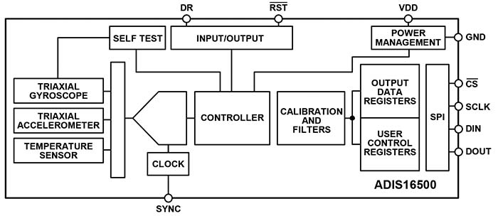 Figura 8: IMU-ul ADIS16500AMLZ integrează un giroscop, un accelerometru, un senzor de temperatură și un lanț complet de semnale pentru achiziția de date și condiționarea semnalelor. (Sursa imaginii: Analog Devices)