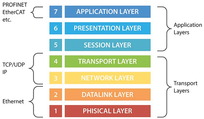 Figura 1: Modelul OSI ilustrează felul în care funcționează protocoalele industriale la diferite niveluri de rețea. (Sursa imaginii: Eaton)