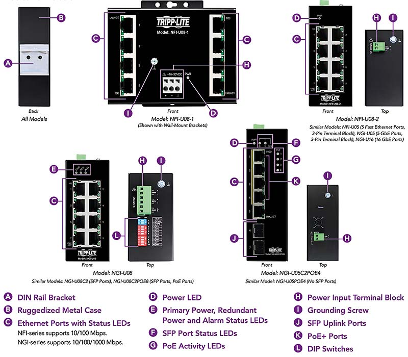 Seria NGI de la Eaton conectează dispozitivele din rețelele industriale, fiind disponibilă în mai multe variante dimensionale. Modelele compacte au cinci porturi, iar cele mari – până la 16 porturi. Modelele mici gestionează până la 14 Gbps de date. Modelele mari gestionează până la 32 Gbps. Toate porturile RJ45 funcționează la trei viteze: 10 Mbps, 100 Mbps și 1000 Mbps. Figura 2 prezintă imaginile produsului și componentele cheie pentru modelele NGI-U08A și NGI-U05C2POE4.