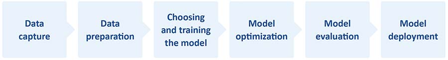 Disponibilitatea datelor de intrare în timp real și a seturilor de date adecvate, pregătirea datelor și antrenarea modelului corespund pașilor 1–3 din figura 1. Optimizarea modelului (pasul 4) este, de obicei, un proces de compresie care contribuie la reducerea cerințelor de memorie (RAM în timpul execuției și memorie nevolatilă pentru stocare), precum și a latenței de procesare.