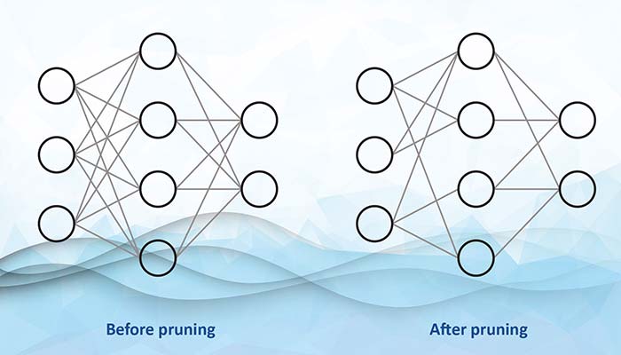 Figura 2: Tăierea (pruning) reduce densitatea rețelei neurale. În exemplul de mai sus, ponderea unor conexiuni dintre neuroni a fost setată la zero. Deși nu este ilustrat, și neuronii pot fi uneori eliminați prin pruning. (Sursă: Microchip)