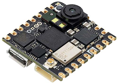 Este echipată cu un procesor puternic STM32H747AII6 Dual Arm® Cortex®-M7/M4 și cu o cameră color de 2 MP, facilitând suportul pentru TinyML (Figura 4). De asemenea, integrează un senzor inteligent de mișcare pe 6 axe, un microfon și un senzor de distanță. Proiectată pentru compatibilitate deplină cu produsele Arduino Portenta și MKR, placa include suport pentru OpenMV, este compatibilă cu MicroPython și oferă conectivitate Wi-Fi și Bluetooth® Low Energy.