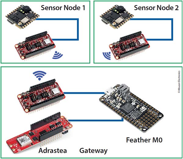 Figura 5: Arhitectura prototipului de detectare a dăunătorilor agricoli, cu noduri senzoriale multiple și un gateway. (Sursa: Mouser Electronics)