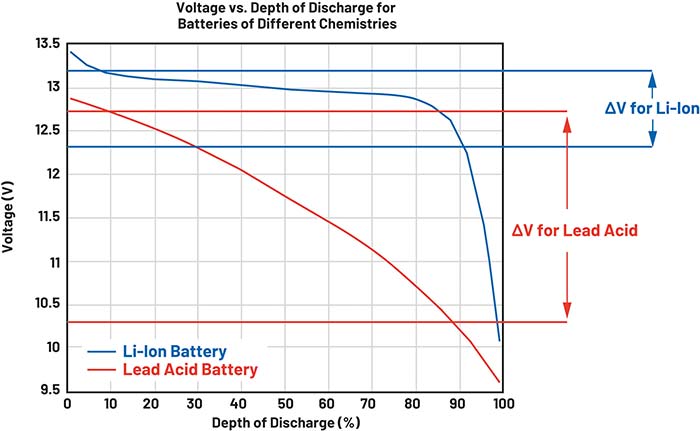 Totuși, aceste avantaje vin cu un cost mai ridicat și implică anumite provocări care trebuie abordate pentru a valorifica pe deplin performanțele bateriilor. Pentru a ilustra acest aspect într-o aplicație reală, putem analiza graficul din figura 2, care compară DoD-ul unei baterii plumb-acid cu cel al unei baterii Li-Ion. Se observă că tensiunea pachetului variază foarte puțin în cazul unei baterii Li-Ion, pe măsură ce aceasta trece de la 0% DoD la 80% DoD. În general, 80% DoD este considerată limita inferioară pentru bateriile Li-Ion, iar orice valoare mai mică poate fi periculoasă.