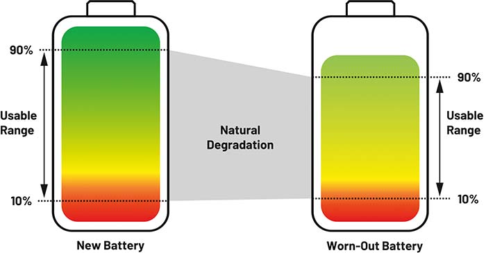 Figura 4: Reducerea autonomiei maxime utilizabile ca urmare a degradării naturale. (Sursa: Analog Devices)