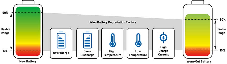 Câteva exemple de factori de degradare ai bateriilor Li-Ion sunt prezentați în figura 5, iar aceștia pot conduce la situații periculoase, precum combustia sau chiar explozia, cu potențial de consecințe catastrofale.2