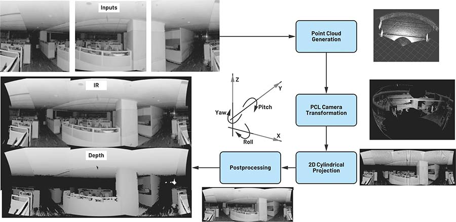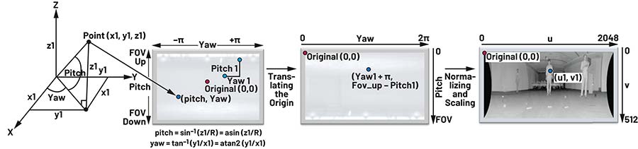 Norul de puncte combinat al câmpului vizual este proiectat pe o suprafață 2D utilizând un algoritm de proiecție cilindrică, cunoscut și sub numele de proiecție frontală (vezi Figura 4). Cu alte cuvinte, algoritmul proiectează fiecare punct al norului de puncte combinat pe un pixel din planul 2D, generând o imagine panoramică continuă care acoperă câmpul vizual total al tuturor senzorilor.
