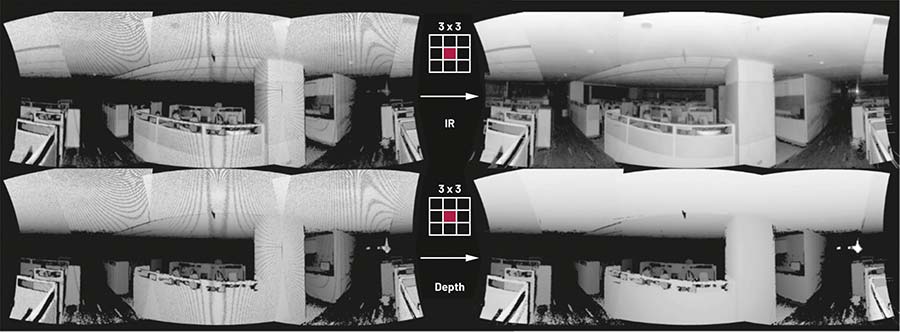 În timpul proiectării norului de puncte 3D pe un plan 2D apar regiuni nemapate/necompletate în imaginea 2D. Mulți pixeli ai norului de puncte (3D) sunt proiectați pe același pixel 2D și, în consecință, o parte dintre pixelii 2D rămân goi (fără valori). Rezultatul este un efect de întindere (stretch) în imagine, așa cum se vede în Figura 6. Pentru a remedia această problemă, a fost utilizat un filtru 3 × 3 care umple pixelii nemapați cu valoarea medie IR/de adâncime a celor 8 pixeli vecini care au valori valide. Astfel se obține o imagine de ieșire mai completă și se elimină artefactele (vezi Figura 6).