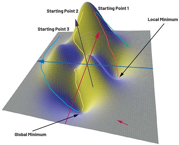 Problema este că punctul de pornire nu este definit în prealabil, ci este ales aleatoriu. În exemplul bidimensional din figura 3, un punct de pornire ales în partea stângă a graficului poate conduce la minimul global (traseul albastru), în timp ce alte puncte pot duce la trasee mai lungi sau la minime locale (traseele galben și portocaliu).