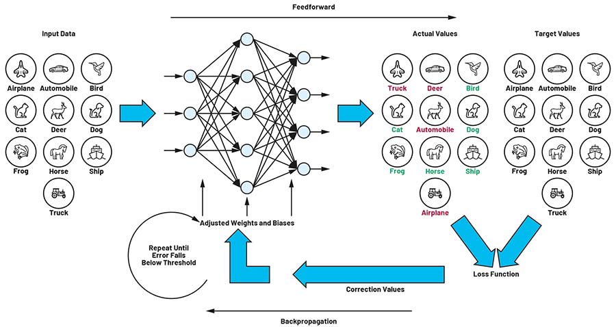 Figura 2: Buclă de antrenare formată din propagare directă (feedforward) și retropropagare (backpropagation). (Sursa imaginii: Analog Devices)