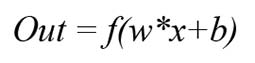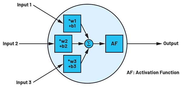 O rețea de neuroni utilizată în inteligența artificială seamănă, la nivel conceptual, cu cea biologică din creierul uman. Un neuron are mai multe intrări și o singură ieșire. Din punct de vedere matematic, un astfel de neuron reprezintă o transformare liniară a intrărilor – înmulțirea acestora cu valori numerice numite ponderi (weights, w) și adăugarea unei constante numite bias (b) – urmată de aplicarea unei funcții neliniare fixe, cunoscută sub denumirea de funcție de activare.1 Funcția de activare, care reprezintă singura componentă neliniară a rețelei, are rolul de a defini intervalul de valori în care un neuron artificial se activează. Funcția unui neuron poate fi descrisă matematic ca: