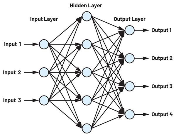 După cum s-a menționat anterior, rețelele neurale convoluționale (CNN) sunt utilizate pentru recunoașterea tiparelor și clasificarea obiectelor conținute în datele de intrare. O CNN este structurată în mai multe secțiuni: un strat de intrare, unul sau mai multe straturi ascunse și un strat de ieșire. O rețea simplă, cu trei intrări, un strat ascuns format din cinci neuroni și un strat de ieșire cu patru ieșiri, este ilustrată în Figura 2.