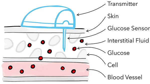 Tehnologia CGM măsoară concentrația de glucoză din lichidul interstițial al pielii (Figura 1). Astfel, metoda este mai puțin invazivă decât testarea clasică a glicemiei din sânge și permite purtarea dispozitivului direct pe piele, pe o perioadă de mai multe zile.
