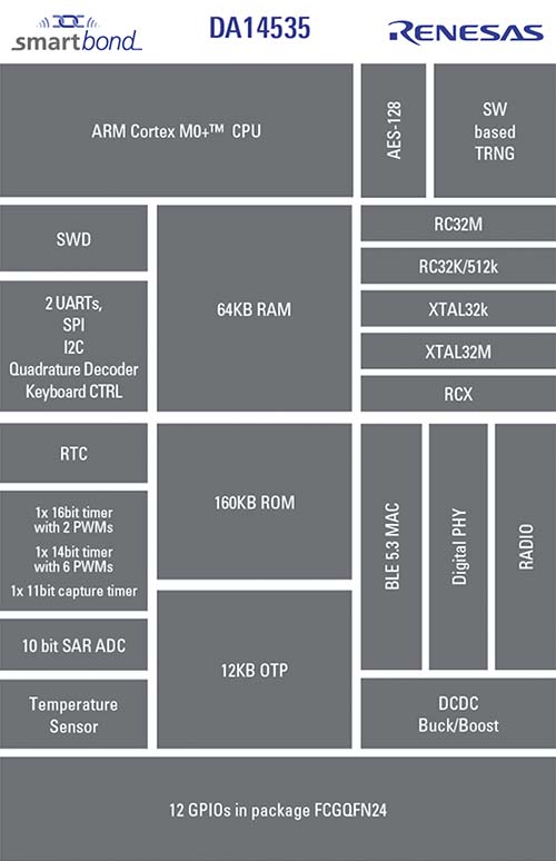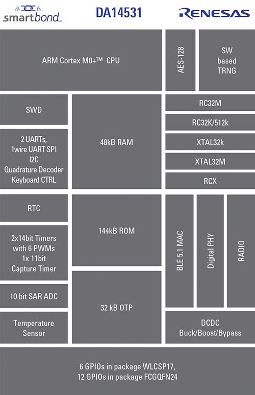 Dispozitivul SoC DA14531 Bluetooth® de la Renesas, caracterizat printr-un consum energetic foarte redus, integrează un transceiver de 2,4 GHz și un microcontroler Arm® Cortex®-M0+ și este disponibil într-o capsulă compactă de 3,0 mm × 2,2 mm. Arhitectura sa permite funcționarea până la descărcarea completă a unei baterii de 1,5 V, inclusiv atunci când tensiunea scade sub valoarea nominală, contribuind astfel la maximizarea duratei de viață a bateriei. Pentru aplicații care necesită mai multă memorie RAM, modelul DA14535 reprezintă o alternativă adecvată.