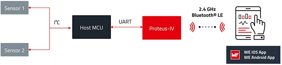 Figura 3: Aplicație tipică pentru monitorizarea sănătății prin dispozitive purtabile, cu doi senzori, controlată de microcontrolerul gazdă (host MCU). Prin UART, microcontrolerul gazdă este conectat la modulul Bluetooth LE Proteus-IV, care realizează conexiunea wireless cu dispozitivul de diagnosticare. (© Würth Elektronik)