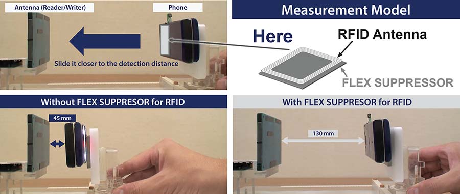 Figura 3 ilustrează efectul Flex Suppressor asupra antenei RFID a unui telefon mobil. În acest test, telefonul mobil este utilizat ca emițător, iar antena (dispozitiv de citire/scriere) drept receptor. Raza reală de acoperire este determinată prin deplasarea telefonului către antenă. Flex Suppressor permite triplarea razei de acoperire. Acest lucru poate influența necesitatea contactului direct în aplicații NFC sau RFID ori posibilitatea ca interacțiunile bazate pe gesturi să fie efectuate de la distanță.