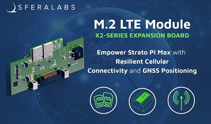 Sfera Labs a lansat o placă de extensie cu modul M.2 LTE din seria X2 (X2BW10XM2Z), o soluție interschimbabilă care adaugă conectivitate celulară LTE și poziționare GNSS serverelor industriale Strato Pi Max XL și XS. Strato Pi Max este un controler industrial compact și versatil, bazat pe Raspberry Pi Compute Module 4 sau 5.